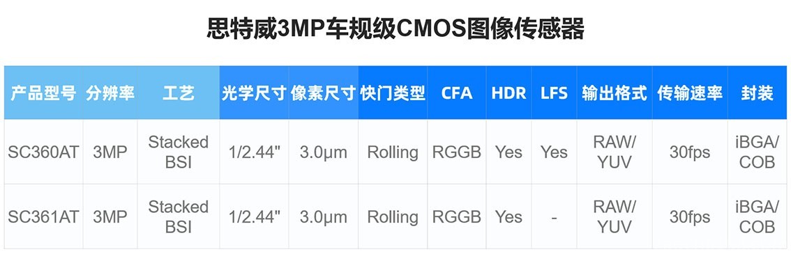 2025年4月17日,思特威(上海)电子科技股份有限公司(股票简称:思特威,股票代码:688213)近日宣布,推出Automotive Sensor(AT)Series系列3MP高性能车规级图像传感器——SC360AT。此款新品是思特威首颗采用CarSens®-XR Gen 2工艺技术打造的Stacked BSI + Rolling Shutter架构图像传感器产品。作为3.0µm像素尺寸图像传感器,SC360AT搭载了SuperPixGain HDR™ 2.0、LFS等多项先进技术,集高感度、高动态范围(高达140dB)、低噪声、低功耗等性能优势并支持LED闪烁抑制,为侧视、后视、环视等多种ADAS应用提供精准可靠的实时影像,满足智能汽车感知系统的升级需求。此外,SC360AT符合ISO 26262 ASIL-B汽车功能安全和ISO 21434汽车网络安全两项车规标准要求,以高可靠性和高安全性,助力汽车智能化与网联化的加速革新。