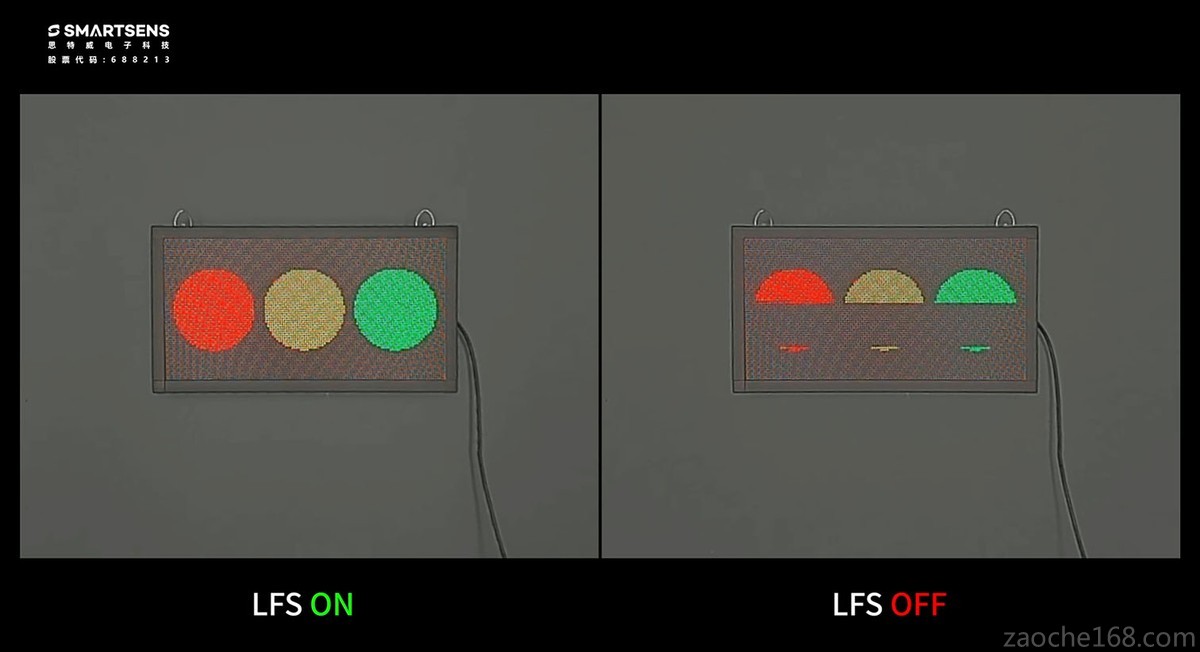 当车辆处于道路行驶过程中,交通信号灯、LED车灯等LED照明设备的LED闪烁现象,会对车载摄像头CIS的画面拍摄效果造成干扰,导致CIS成像画面出现条纹、闪烁光斑等现象,影响驾驶员、辅助驾驶系统对交通路况的判断。SC360AT搭载了思特威自主研发的LFS技术(LED闪烁抑制技术),通过调整部分像素的曝光时长来覆盖LED频闪间隙,最终得到无LED闪烁的完整影像信息,能帮助ADAS系统准确识别交通信号灯、附近其他车辆的车灯颜色和状态并做出及时决策。
