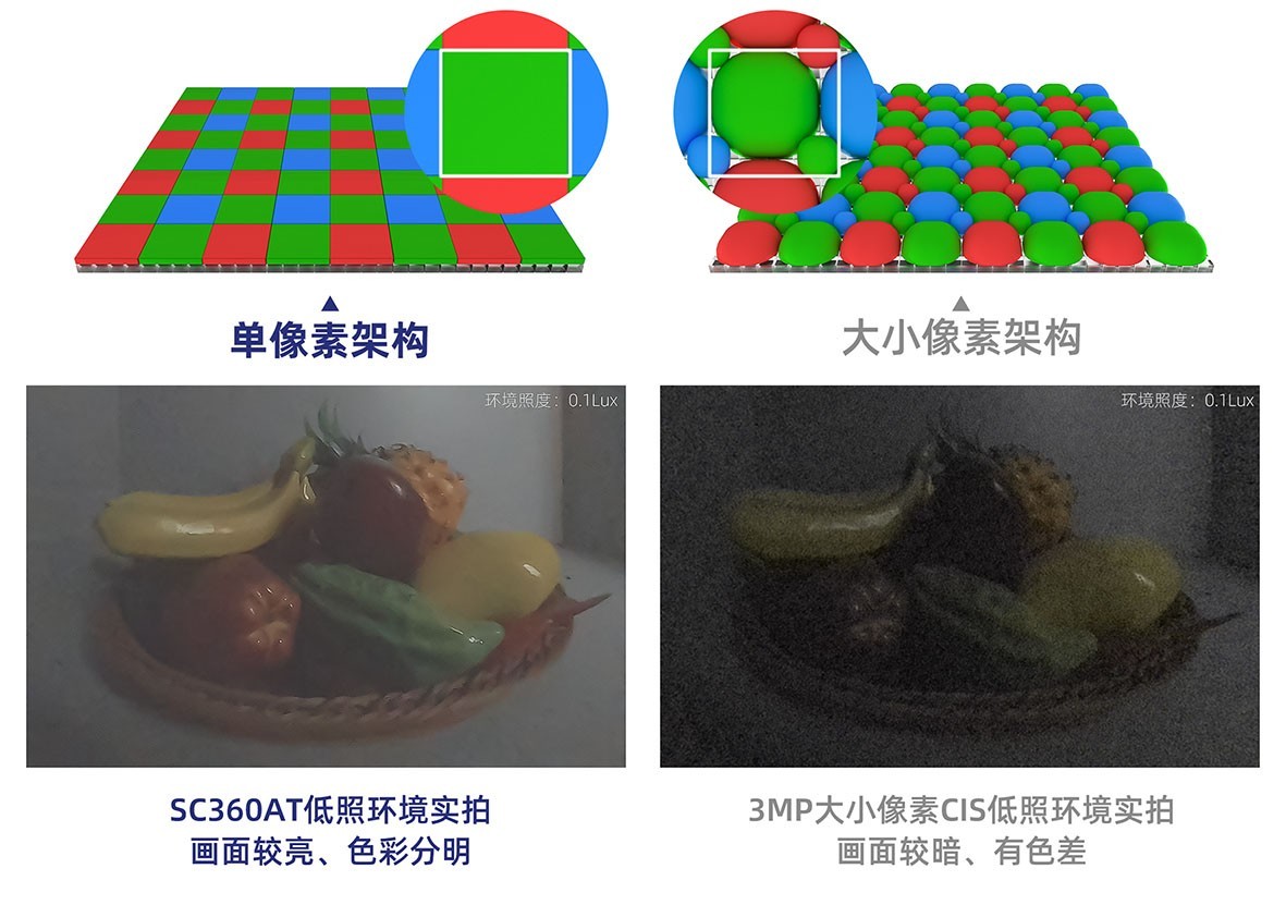 SC360AT图像传感器创新采用了SuperPixGain HDR™ 2.0技术,通过单像素 + 溢出电荷存储架构,实现了感度和信噪比的双重提升。SC360AT的感度高达12348mV/lux*s,其在520nm可见光波段下的峰值量子效率(QE peak)高达82%。相较传统大小像素架构CIS,基于单像素+溢出电荷存储架构的SC360AT有效避免了因大小像素架构引起的光学串扰、色差等问题,以出色的感度和信噪比,为摄像头提供明亮清晰的高品质画面。