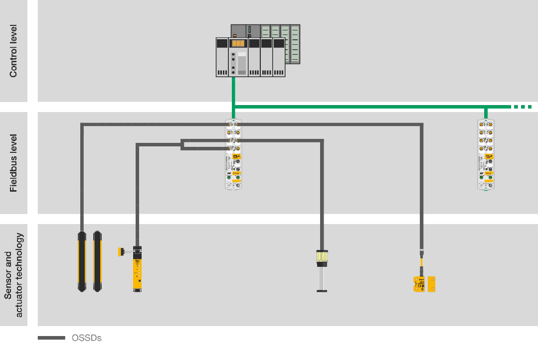 IO Link Safety推出以前,我们通常是将安全相关的传感器、开关和执行机构连接到1个现场总线/网络站点(IP67或者IP20)上,由这个站点向上再传输每个器件的简单状态信息(ON/OFF)或者控制每个执行部件(ON/OFF)。从通信层面来看并未到达传感器和执行机构这一现场层,因此现场层上的很多诊断信息都是无法被控制器获取的,例如安全开关的温度、安全光幕的供电电压、执行机构的剩余动作次数寿命等。