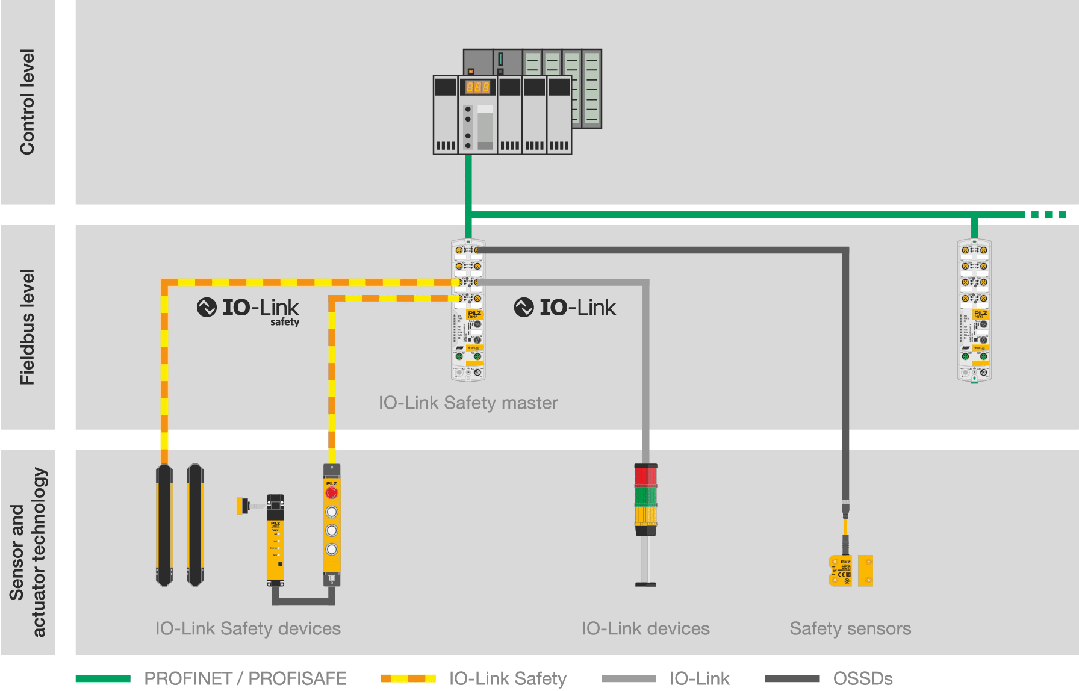 有了IO Link Safety协议后,安全传感器、安全执行机构厂家可以轻松地利用2线制原理将IO Link Safety协议集成在安全部件上。这些安全部件通过简易的2线制电缆连接到IO Link Safety Master站点后就能轻易地连入自动化网络中,例如PROFInet, EtherCAT等,这样的网络架构不会过多占用上层网络协议的站点数量—仅IO Link Safety Master站点会占用,也不会使得原有的安全部件价格成本大幅度提高。