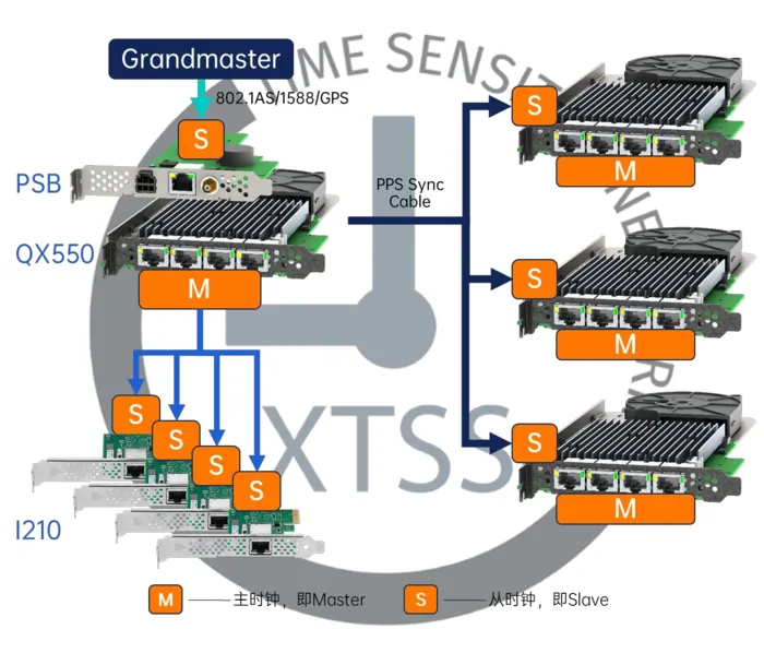 PSB+QX550 方案中,QX550 作为 PCIe 3.0 x8 网络卡,搭载双 Intel X550-AT2 控制器,提供 4 个 10Gbase-T 接口,支持 IEEE 1588v2(PTP)和 802.1AS-2020(gPTP)协议。配套的 PSB 模块则通过 Intel i210IT 芯片、u-blox GPS 模块及 PPS(脉冲每秒)接口,实现硬件级时间戳同步与多源时间校准。